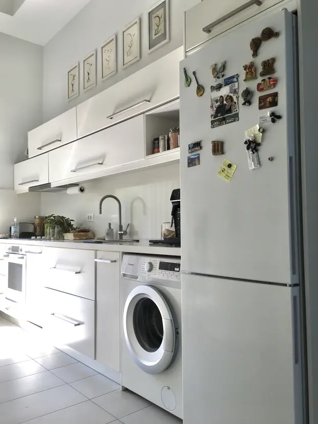 Open inbouwkeuken met nieuwe (6 maanden oude) Bosch-apparaten in wit, inclusief wasmachine — de keuken is inbegrepen in de koopprijs.