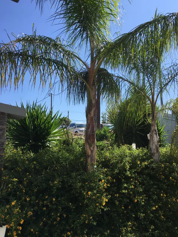 De voortuin is beplant met palmen en bloemen.