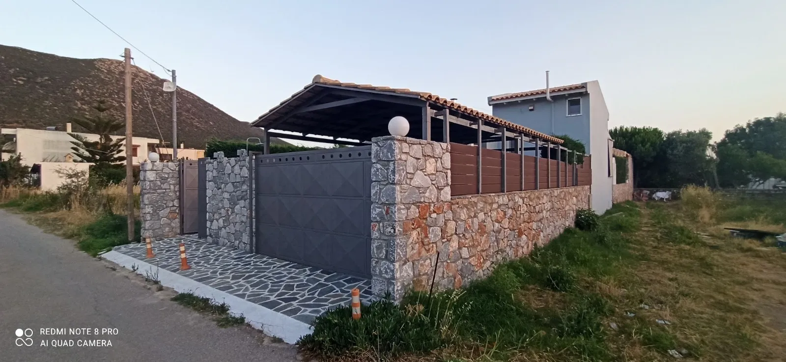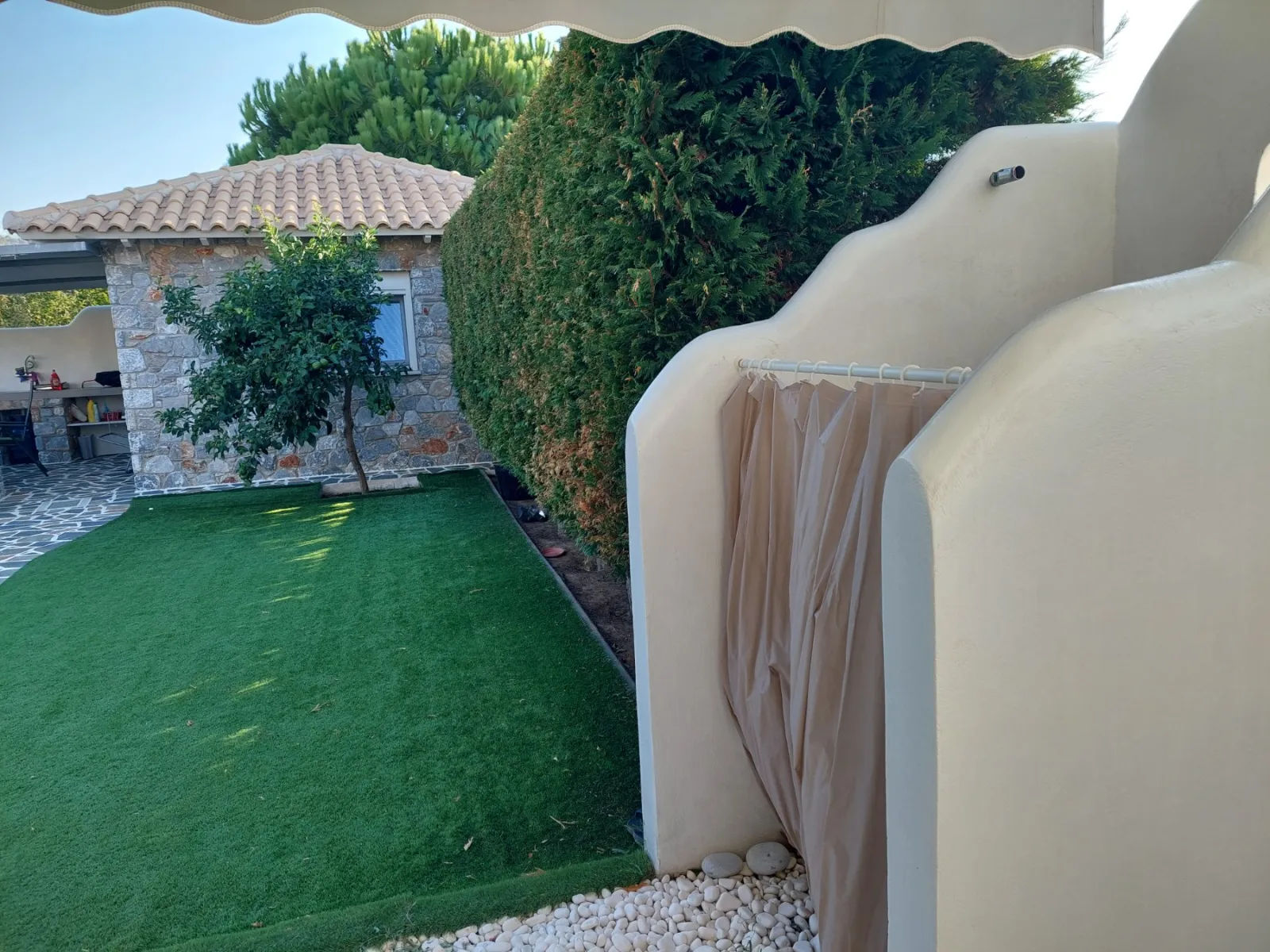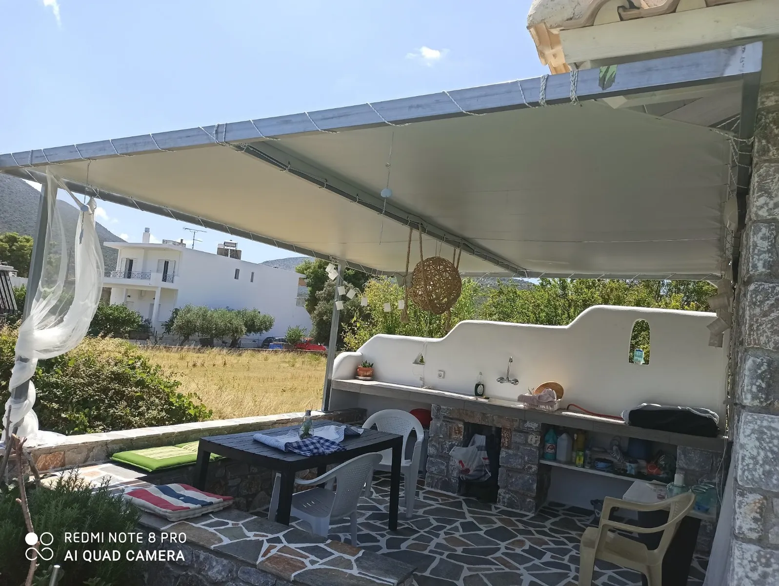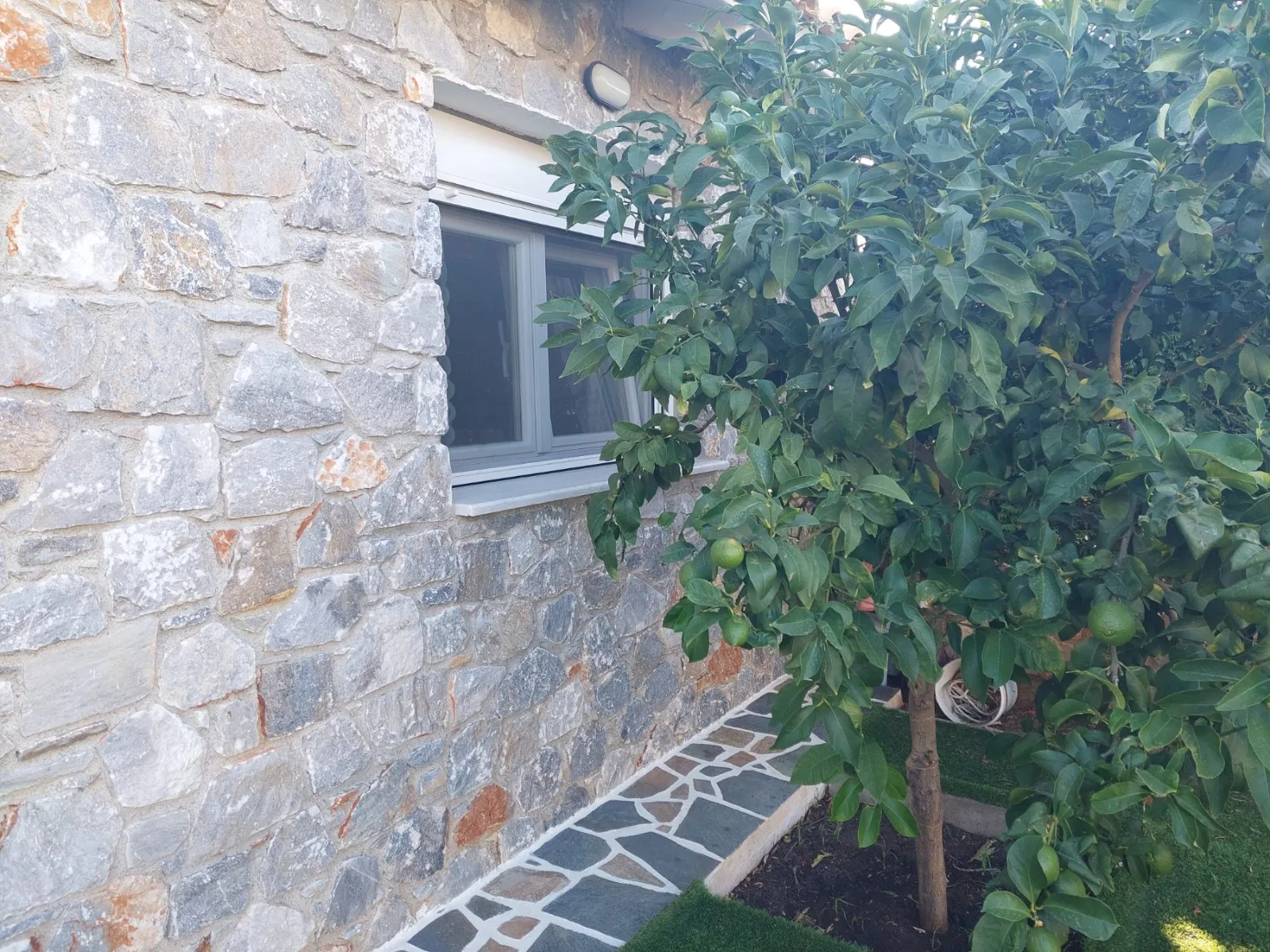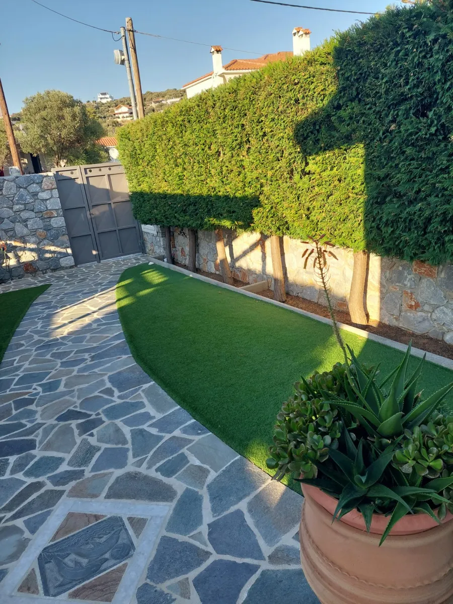 De buitenkant heeft een opvallend grijsblauw kleurenschema, aangevuld met een stenen muur die het perceel omringt. Binnen versterkt de minimalistische, volledig witte kleurstelling het ruimtelijke gevoel van de tegelvloeren. Extra voorzieningen zijn onder andere een buitendouche met warm water, een alarmsysteem met camerabewaking en een ruime tuin van 200 vierkante meter. Gelegen op slechts 30 meter van het strand van Panagia Almyropotamos en op slechts 150 kilometer van Athene, biedt deze woning zowel rust als gemak.