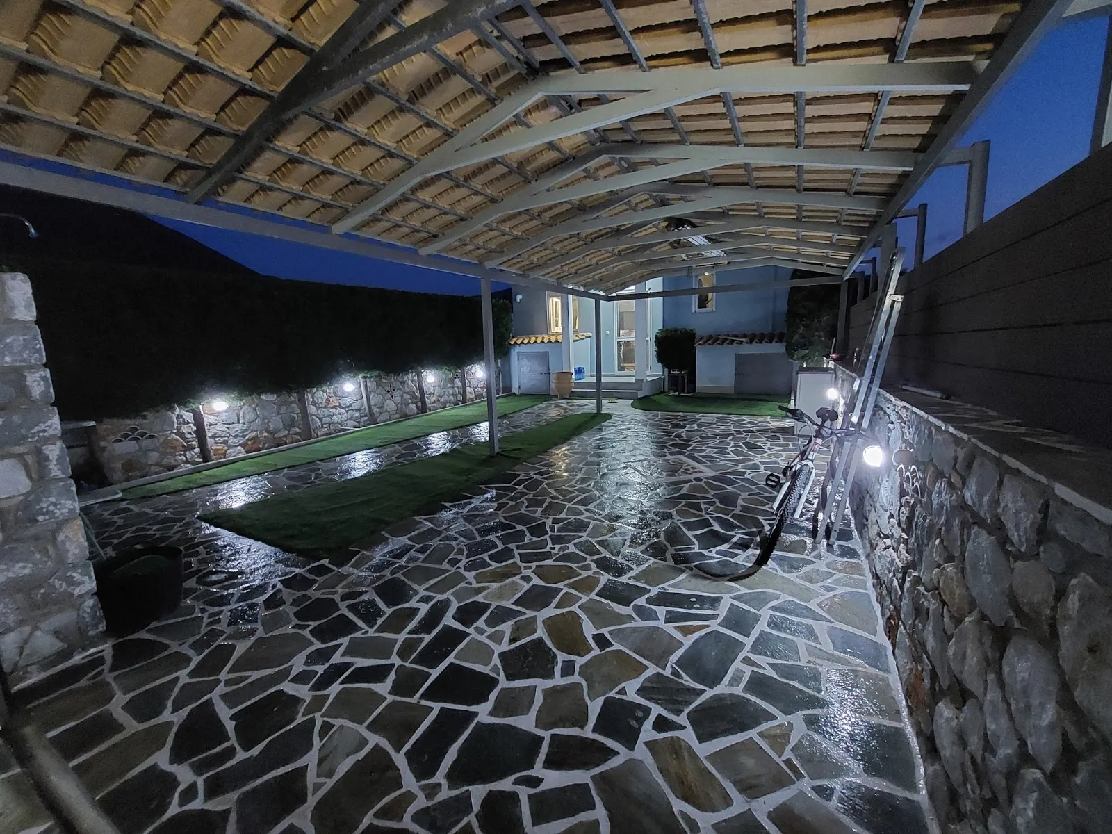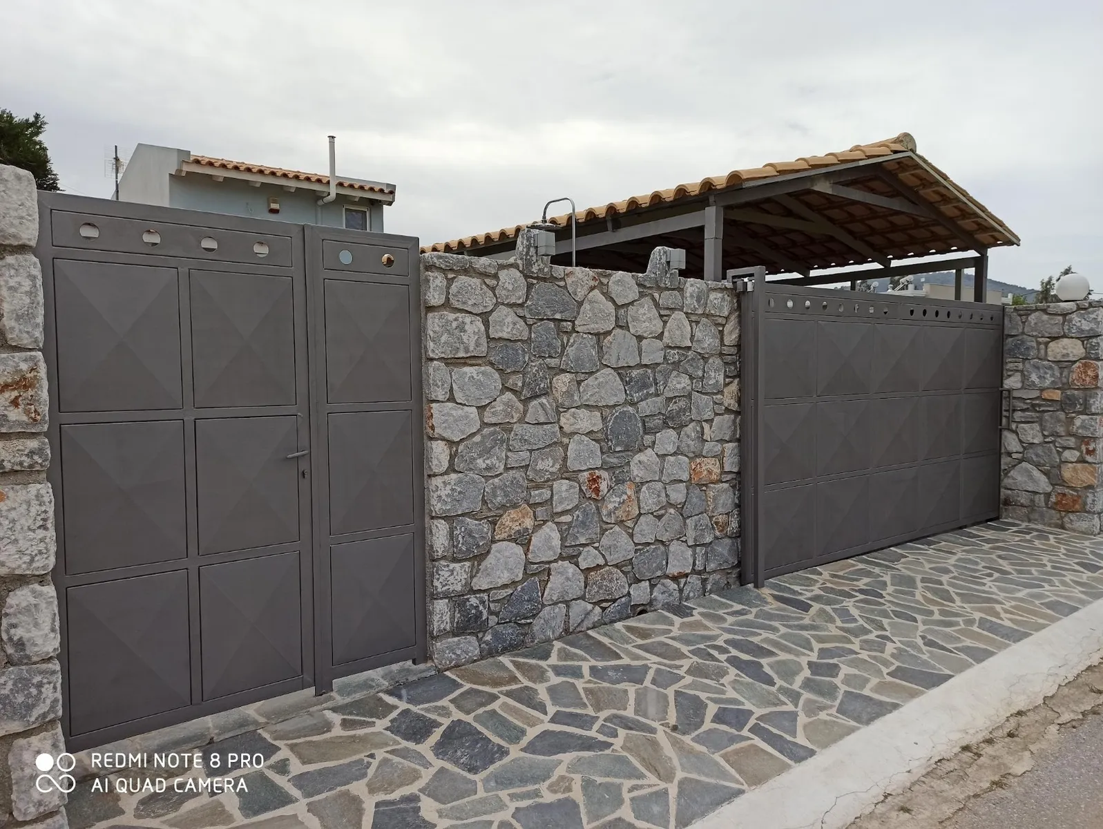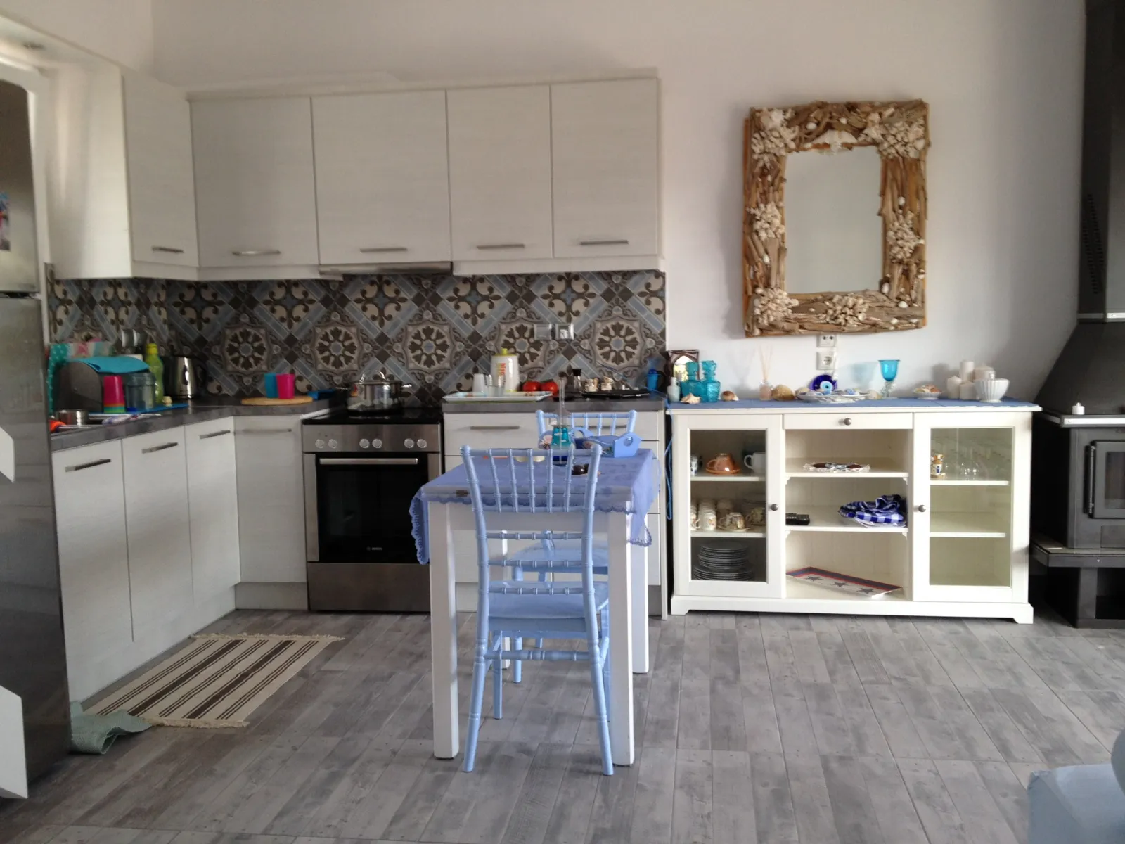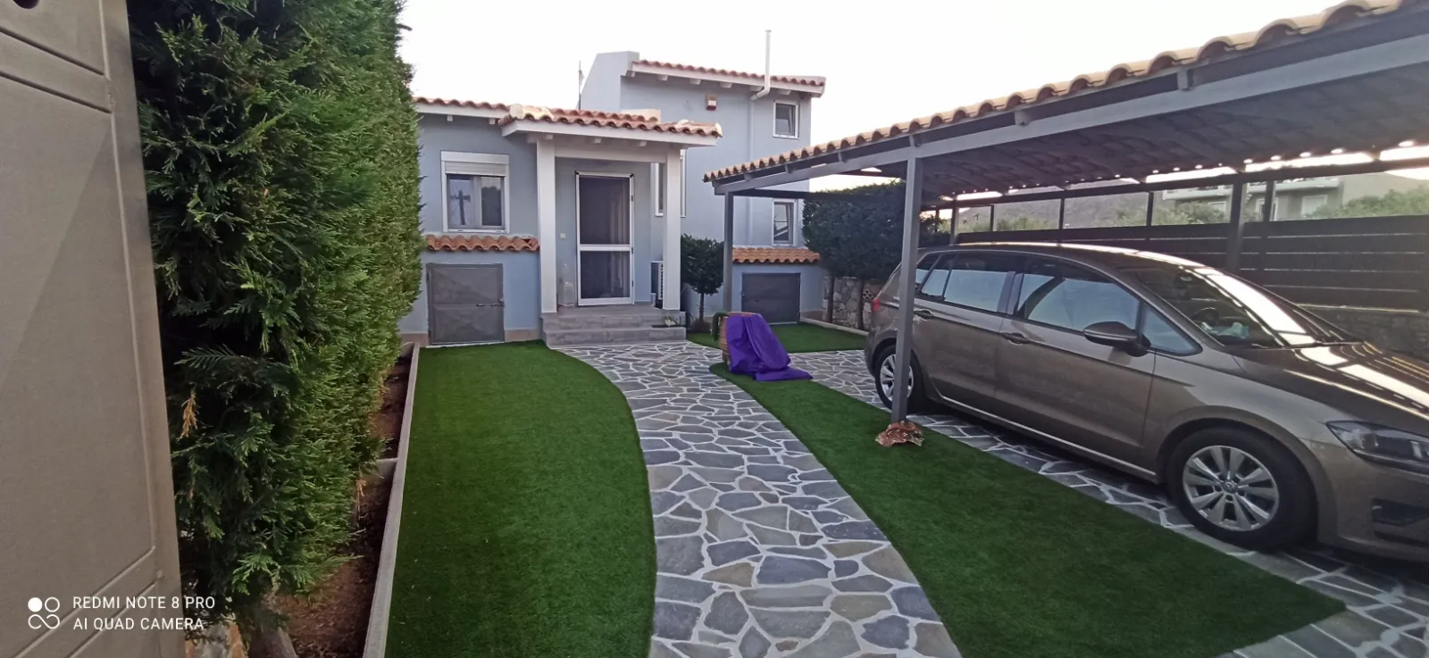 De buitenkant heeft een opvallend grijsblauw kleurenschema, aangevuld met een stenen muur die het perceel omringt. Binnen versterkt de minimalistische, volledig witte kleurstelling het ruimtelijke gevoel van de tegelvloeren. Extra voorzieningen zijn onder andere een buitendouche met warm water, een alarmsysteem met camerabewaking en een ruime tuin van 200 vierkante meter. Gelegen op slechts 30 meter van het strand van Panagia Almyropotamos en op slechts 150 kilometer van Athene, biedt deze woning zowel rust als gemak.