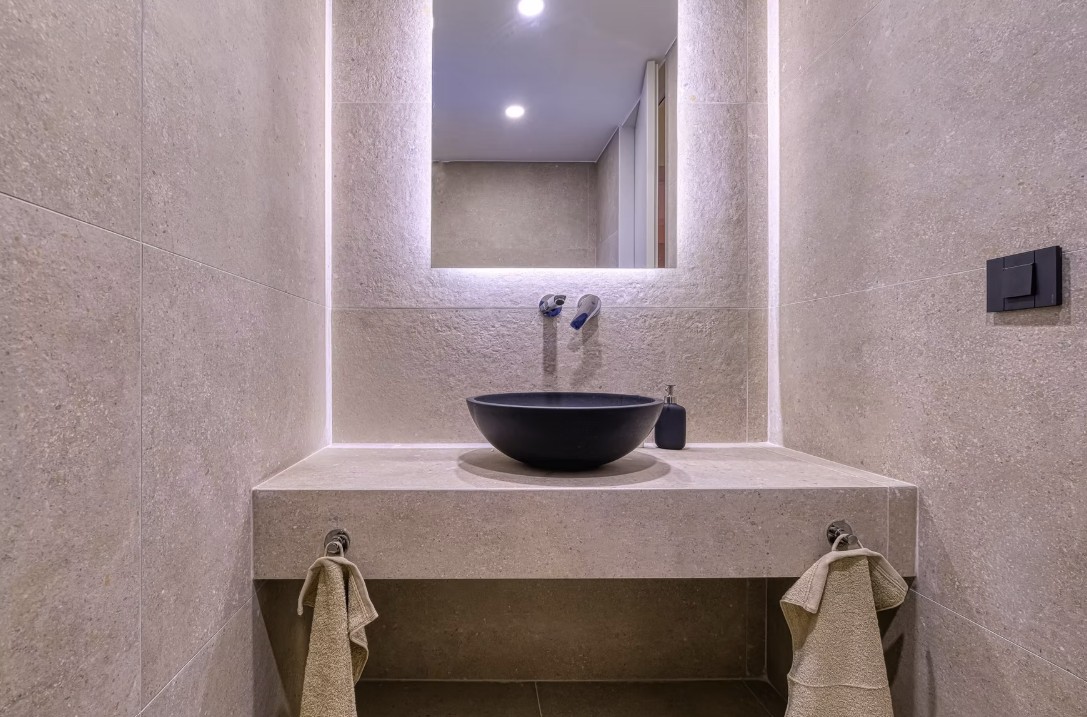 De woning onderscheidt zich door haar eigentijdse architectuur, met een harmonieuze combinatie van natuursteen, beton en glas. Dit zorgt voor een lichte en elegante leefomgeving. Grote raampartijen laten veel natuurlijk licht binnen en versterken de verbinding tussen binnen- en buitenruimtes.