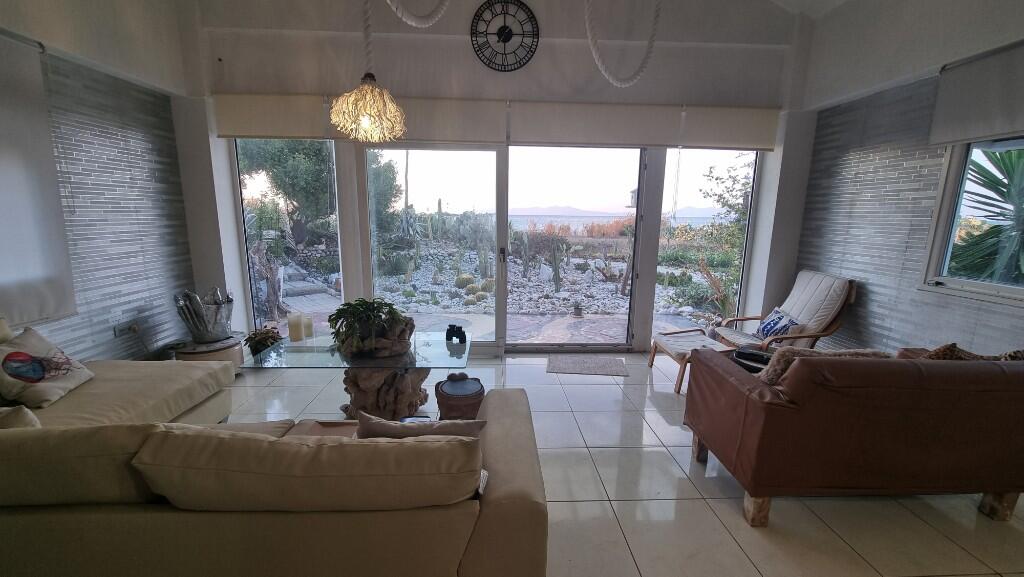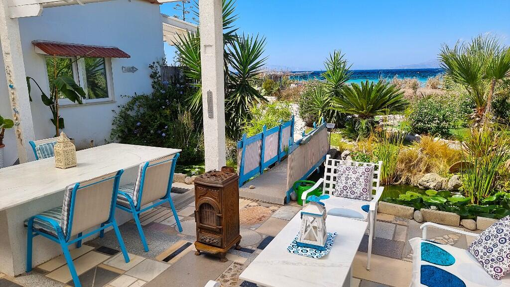 Zoeekt u naar een villa aan het strand in Paradisi Rhodos? Deze milieuvriendelijke woning beslaat een oppervlakte van 129 m² en is gelegen op een royaal perceel van 4.000 m². Het biedt volop buitenruimte en de mogelijkheid tot uitbreiding met plannen voor twee extra slaapkamers en badkamers op de eerste verdieping. De woning is tien jaar geleden gebouwd volgens de wensen van de eigenaar en beschikt over een ruime, open woonkamer die naadloos aansluit op een overdekte patio van 43 m², versierd met een marmeren mozaïekvloer – ideaal om gasten te ontvangen terwijl u geniet van een panoramisch uitzicht op de tuin en de zee.